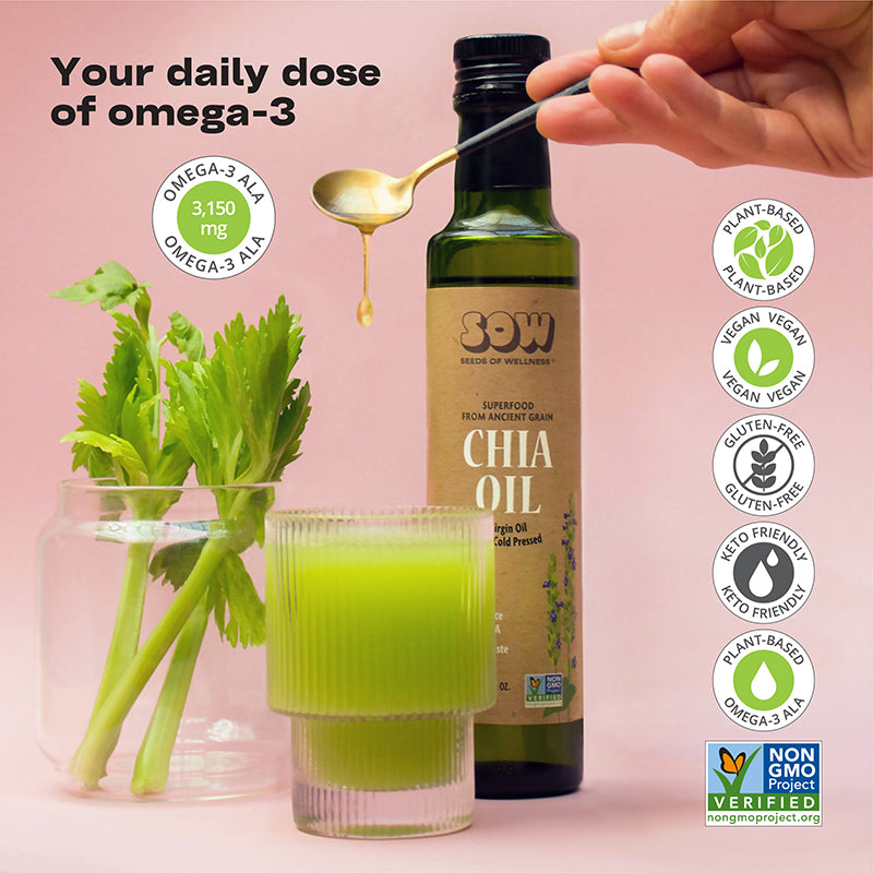SOW Seeds of Wellness® Chia Oil is cold-pressed from 100% pure chia seed, cultivated with passion and care in South America. Grown by regenerative agriculture, chia is one of the most sustainably grown crops in the world. Chia is the most abundant source of omega-3 ALA in nature and chia oil provides an excellent source of this essential nutrient. In addition to omega-3 ALA, chia oil is high in phytochemicals with antioxidant and anti-inflammatory properties.
